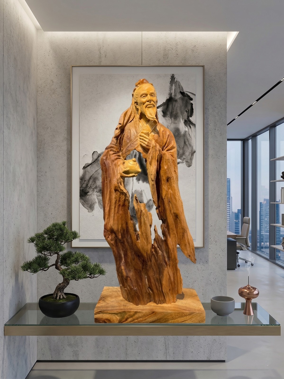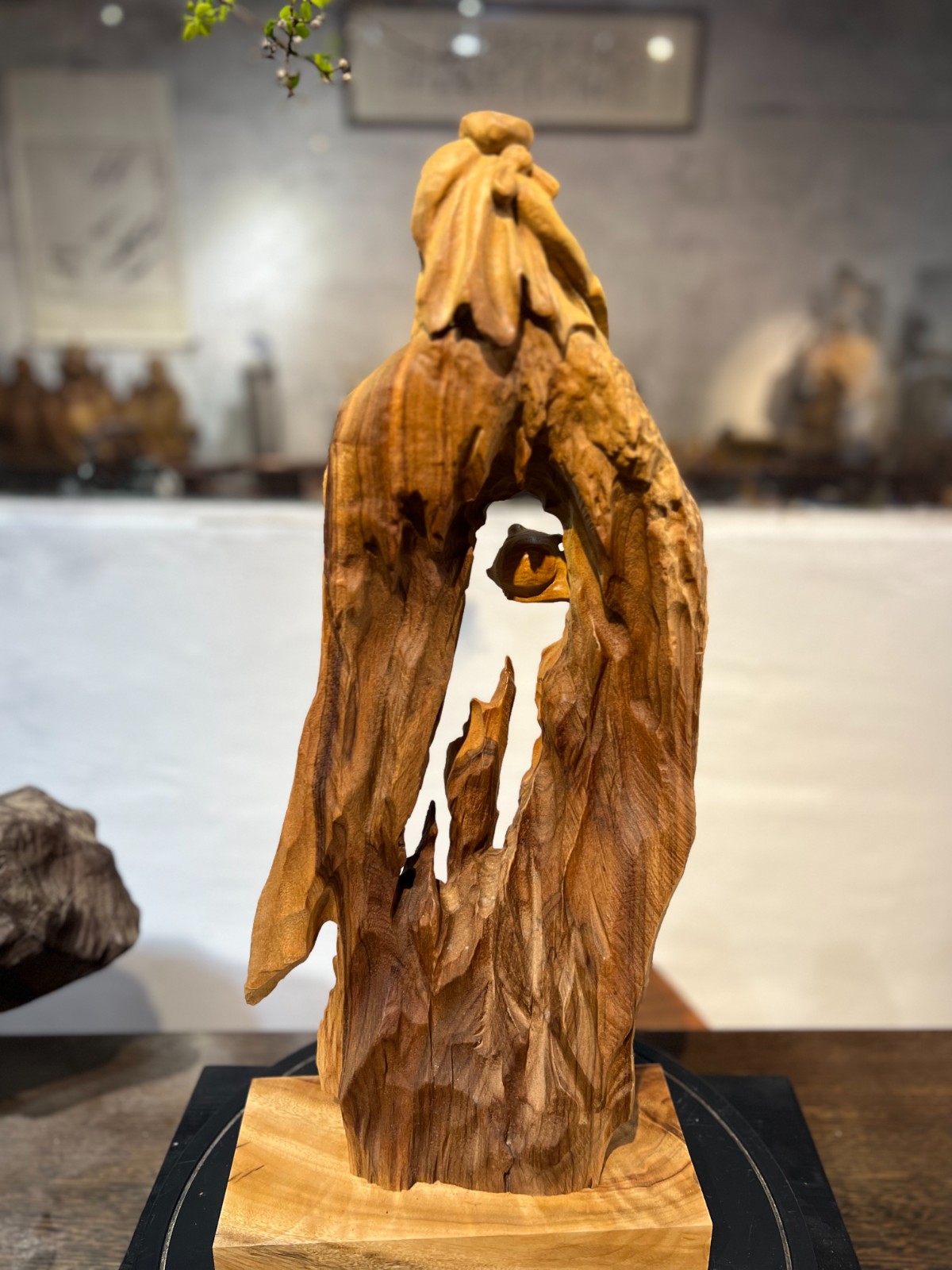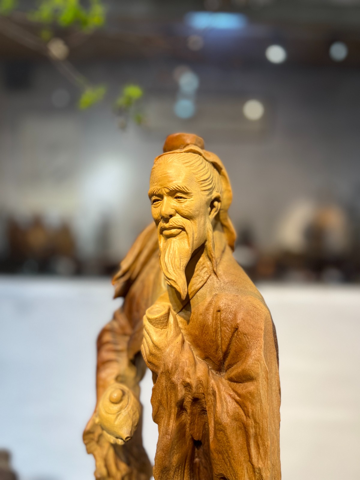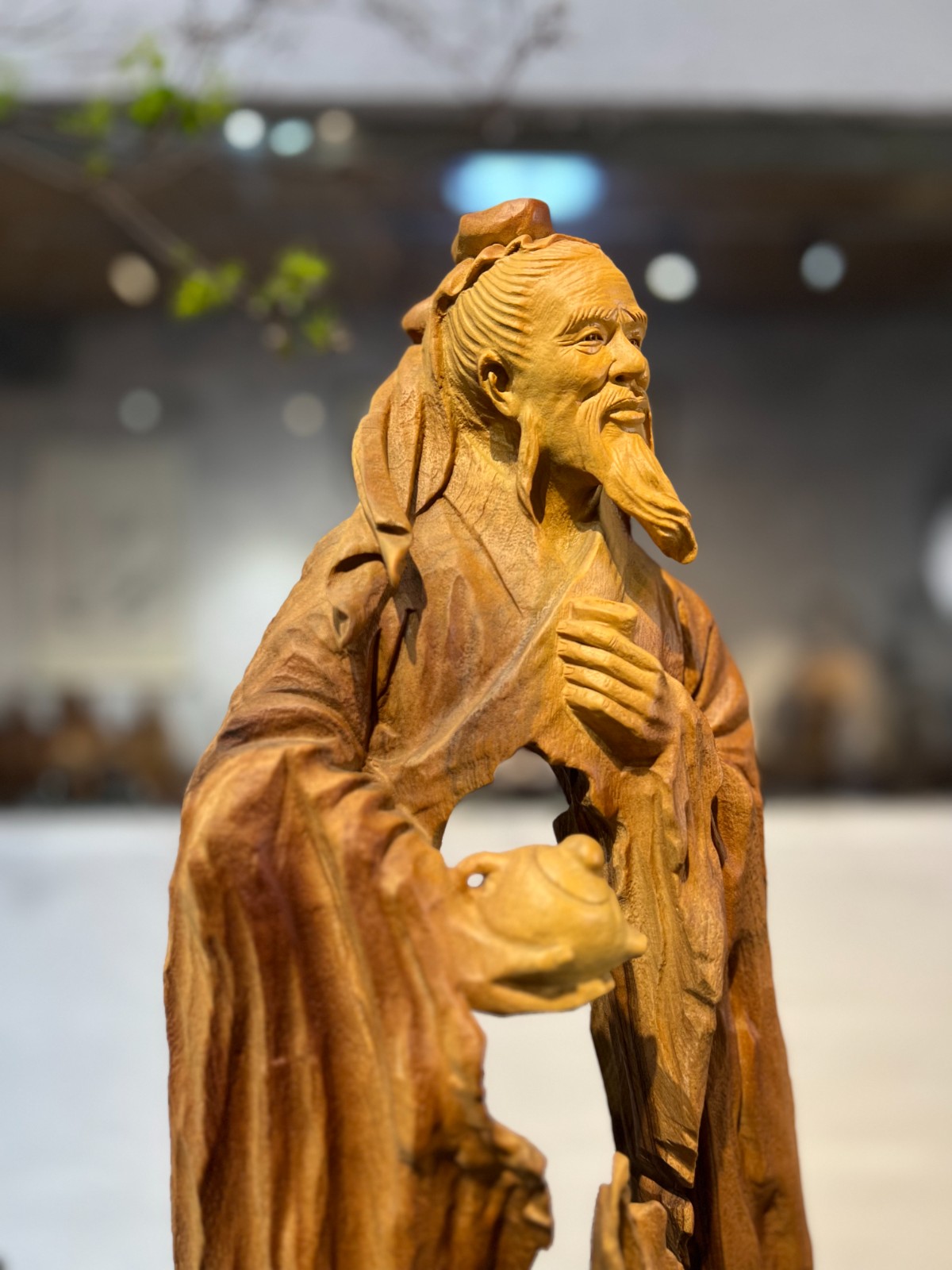 大師級鏤空巧雕:順應原木天然的形態與肌理,施以高難度的「鏤空巧雕」技法。衣襬的褶皺宛如隨風飄動,展現出「天人合一」的流暢美感與藝術張力。