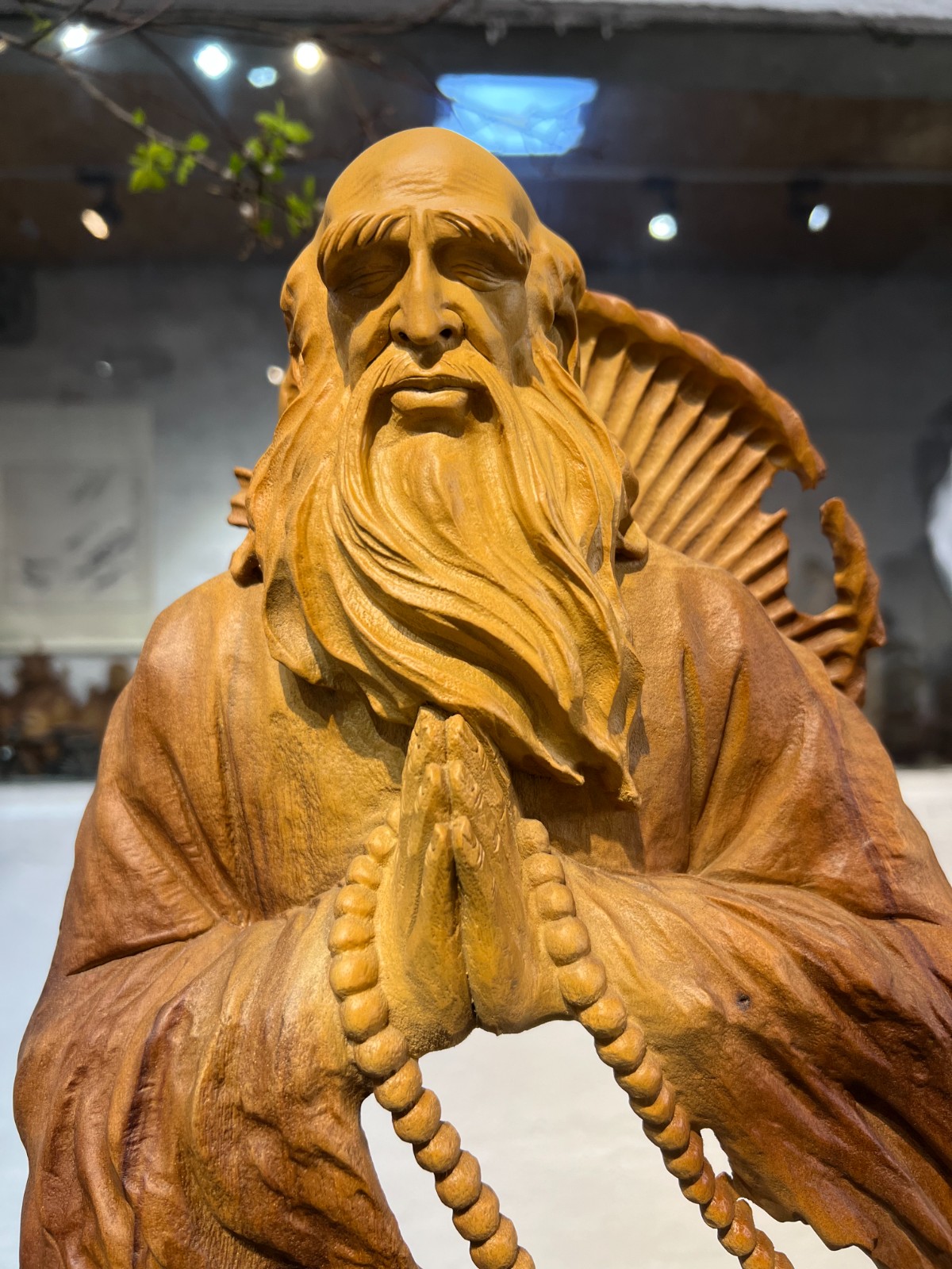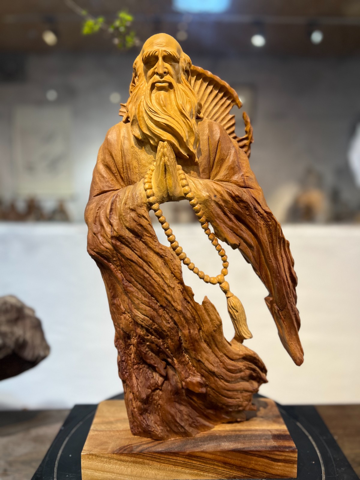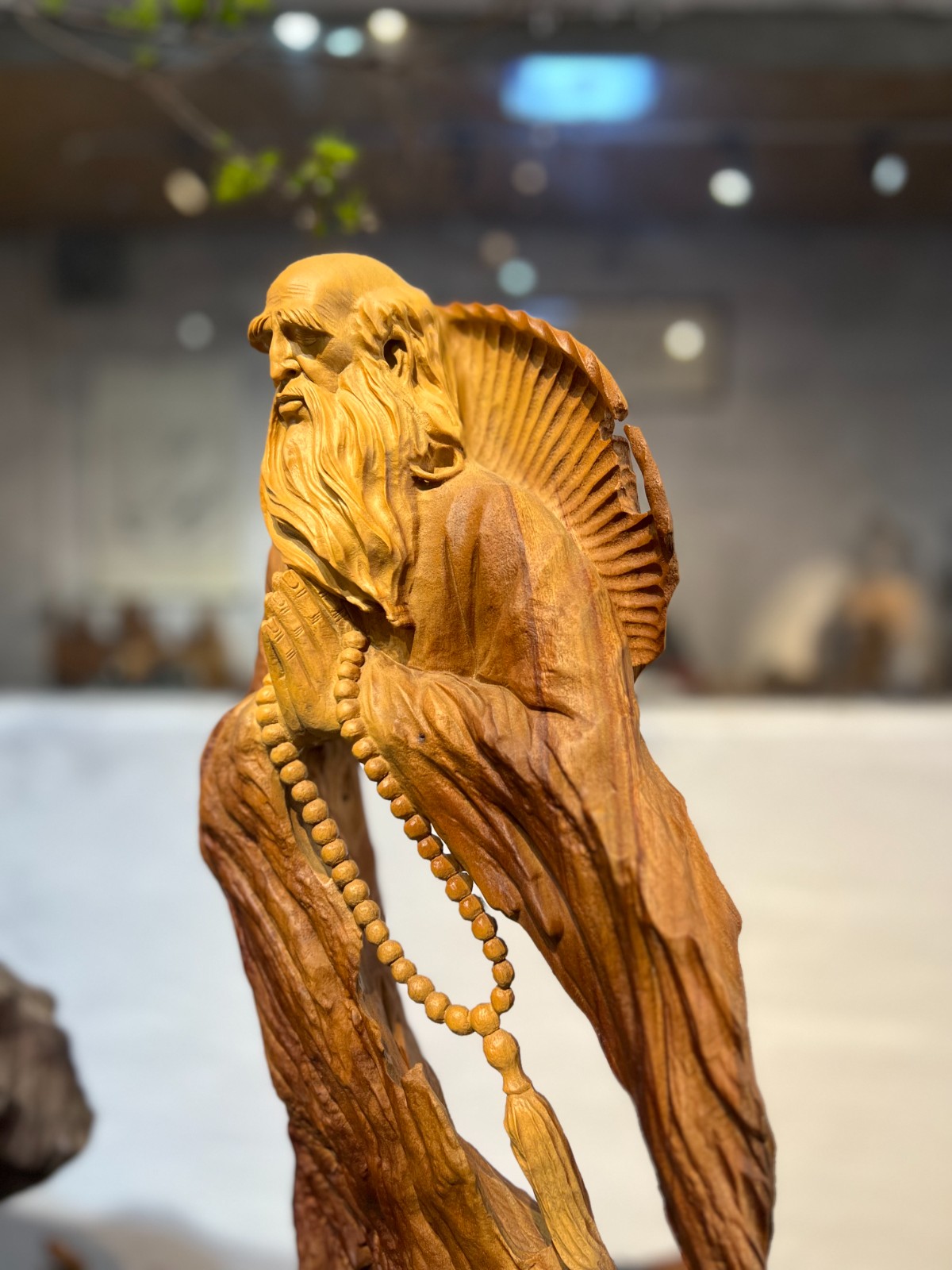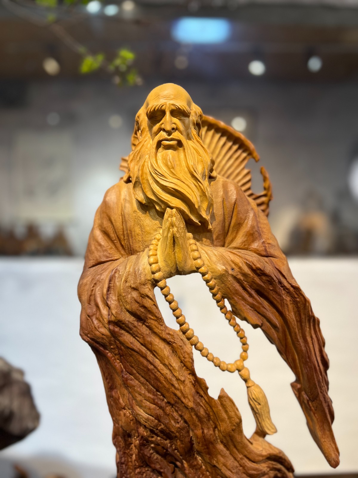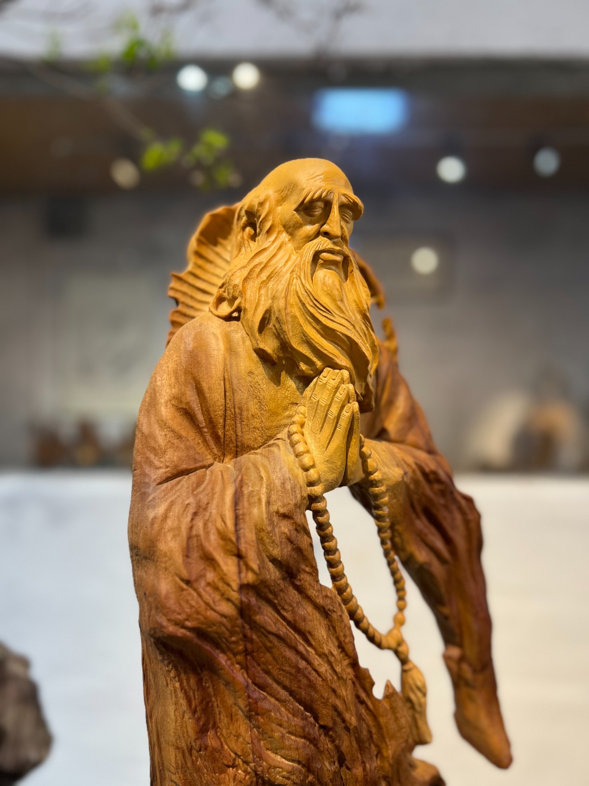 這尊達摩雙手合十,莊嚴肅穆,盡顯禪修之境。長佛珠垂於身前,細緻的根雕肌理與佛珠細節,讓人心生敬畏。
